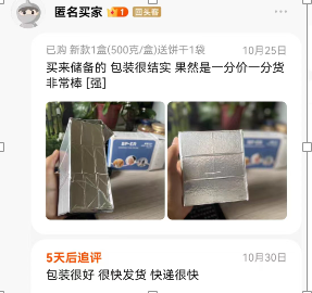 小海豚能量立方谷物压缩饼干在京东、淘宝、天猫、拼多多等众多平台销售,获得了一致好评,消费者对食品的味道、质量或其他方面赞赏不已,连连称赞。也由于食品的高品质和好味道,吸引了大量回头客,以下为客户真实评价: