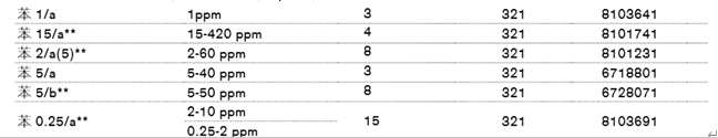 目前我们所最常用的苯检测管型号是检测管 苯_0.25/A 0.25-10PPM 10'S/PKT_德尔格_8103691以及检测管 苯_2/A 2-60PPM 5'S/PKT_德尔格_8101231,这两款检测管能匹配大多数的检测情况,也是我们常备库存的产品。